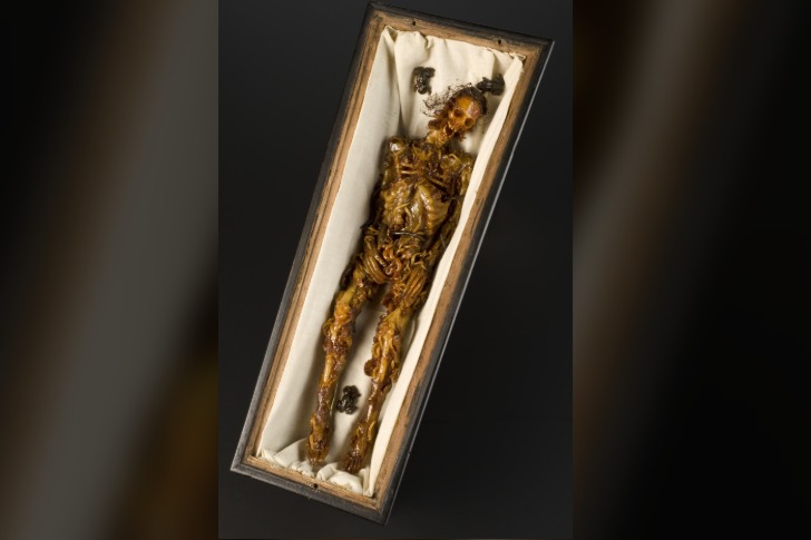 #32 腐敗した遺体の蝋人形、クルミの棺桶入り、イタリア、1774-1800年頃。