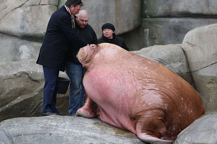 Walruses are massive marine mammals known for their long tusks and whiskered faces. Adult males can weigh over 3,000 pounds and measure up to 12 feet in length. They use their tusks for defense, dominance displays, and hauling themselves out of the water onto ice floes. Their thick blubber provides insulation in the frigid Arctic waters.