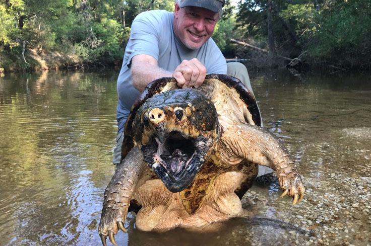 These turtles are ambush predators, lying motionless in the water with their mouths open, waiting for fish to swim in. Their tongue has a worm-like appendage that they use as a lure to attract prey. Once a fish is close enough, they snap their jaws shut with incredible force, making them effective hunters in their murky freshwater habitats.