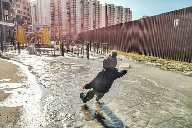 At first glance, this image looks like a joyful winter scene — a child bundled up in warm clothes, arms outstretched, mid-stride on a sunlit street. But the gleam on the ground tells a different story: that’s not pavement, that’s a slick sheet of ice. Caught in the perfect moment before disaster, the child is in mid-air, legs splayed in opposite directions, just a heartbeat away from an epic fall.