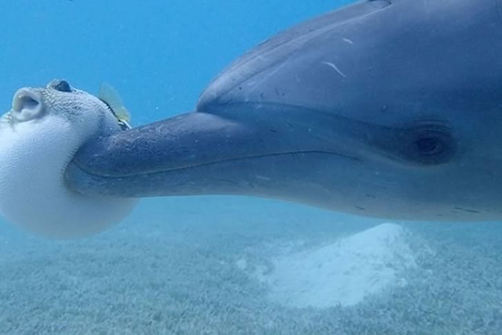 The image strikes a whimsical balance between absurdity and biological wonder. While puffing up is a defense mechanism meant to deter predators, this dolphin seems more amused than deterred. Scientists have even observed dolphins carefully handling pufferfish, possibly for the mild toxin-induced buzz they produce. Whether that’s what’s happening here or just a playful interaction gone awkward, one thing’s for sure: this snapshot is pure underwater comedy gold.