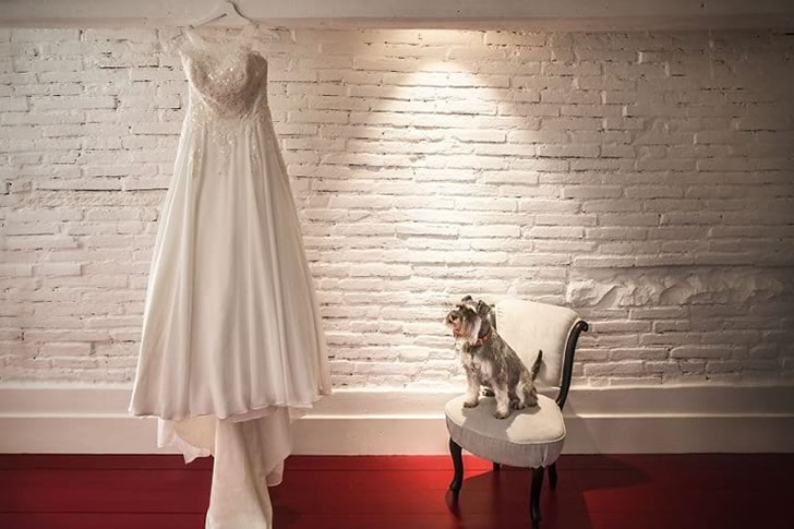 As the bride shows off her stunning wedding dress, stealing the spotlight with elegance, a little puppy can’t help but be drawn in by the beauty of the scene. It climbs onto a nearby chair, inching closer to the fabric.