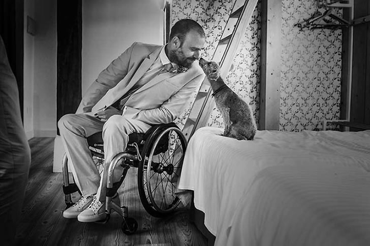 The moment feels deeply personal, as if the groom is making sure his furry best friend is part of the celebration too. The pet, calm and focused, listens intently. It’s a photo that captures more than style—it reveals the bond between man and companion.