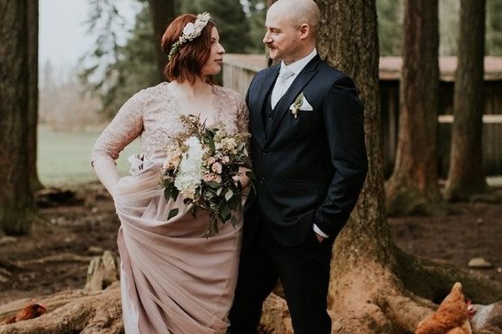 In a charming forest setting, a bride and groom stand together near a towering tree, their elegant attire contrasting with the rustic surroundings. Surrounding their feet are a flock of curious chickens, pecking at the ground and drawing attention with their unexpected presence. The bride’s delicate bouquet and the groom’s sharp suit are momentarily overshadowed as the chickens add a whimsical touch to the wedding scene.