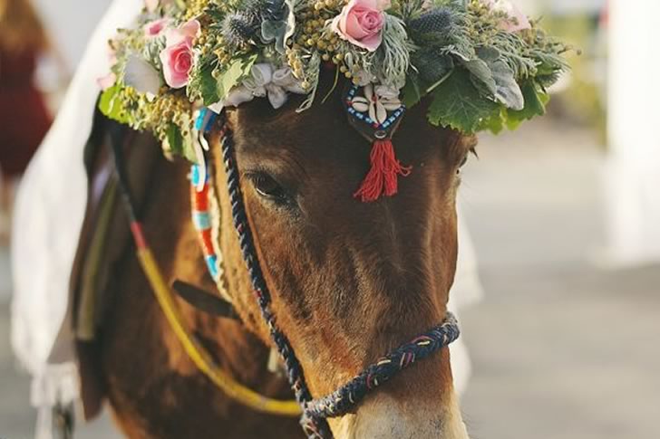 On a sunlit path, a donkey adorned with a floral crown stands as the focal point, led by a handler near a wedding setting. The donkey’s intricate decoration outshines the subtle background, drawing attention with its striking appearance. The bride and groom, though elegantly dressed, take a backseat as the donkey’s beauty captivates the moment.
