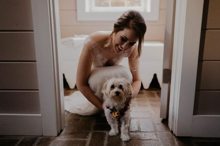 Inside a cozy room with a bathtub in the background, a bride kneels in her elegant white dress, smiling warmly at a small dog adorned with a floral collar. The puppy’s cute expression and decorated neck draw all attention, overshadowing the bride’s stunning attire and the soft lighting. The intimate setting enhances the moment, but the dog steals the spotlight with its charm.