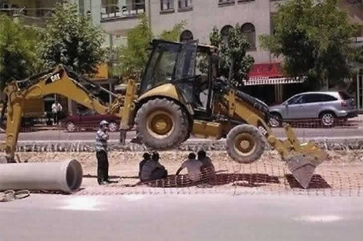 This excavator didn’t get the memo about metaphors. One minute digging holes for others, the next – creating its own personal swimming pool.