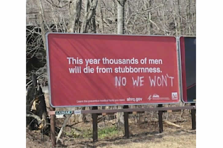 Billboards say: Stubborn men die young. Men reply: Nonsense—we just prefer long, healthy lives!