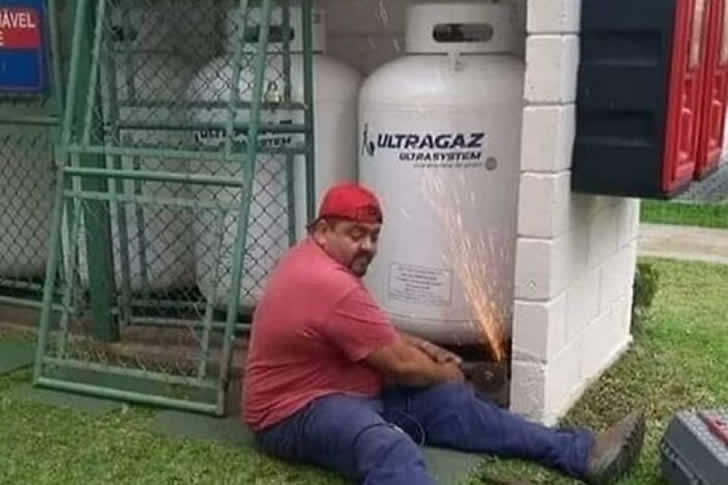 Meet the local welder who’s all about that #NoLimits lifestyle. With a welding torch in one hand and a “ULTRAGAZ” tank in the other, he’s single-handedly redefining “lighting up the room.” His outfit? Red bandana = fireproof. Jeans?