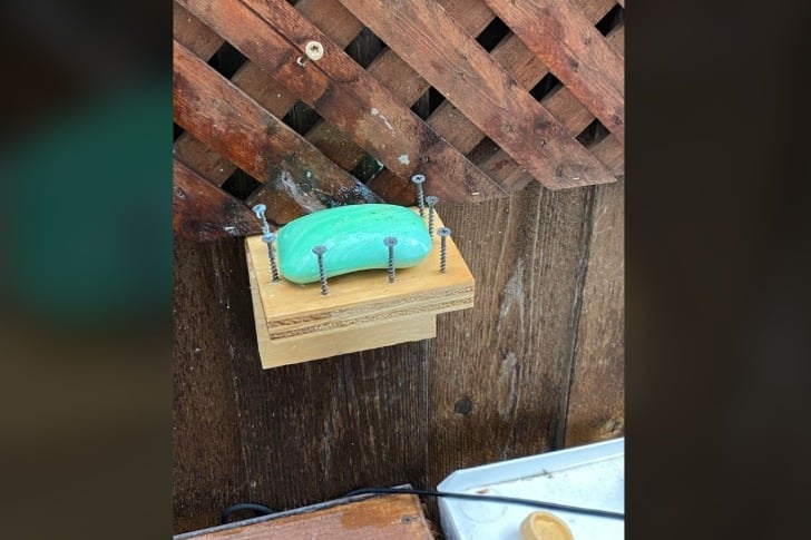 Here’s a better redneck-tip: put the soap in one of those plastic nets that comes with fruits or vegetables. Hang that net on a proper, like not sharp at all, hook and voilà! No tetanus shot needed. No slippery soap. No problem.