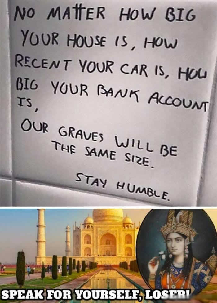 The joke or quote in the image implies that everyone gets a “humble resting place” after death, but clearly that’s not true in this case—some people have incredibly elaborate and expensive tombs. The humor comes from the contrast between the idea of a simple resting place and the reality of extravagant ones like the Taj Mahal.