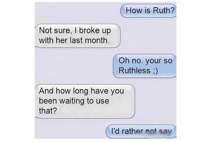 So this person was dating a girl named Ruth. Since they broke up, he is no longer with Ruth, which makes him “Ruth-less.” This is a clever play on words, or pun, because “ruthless” is a real word meaning without pity or compassion, and here it’s used literally to mean “without Ruth.”
