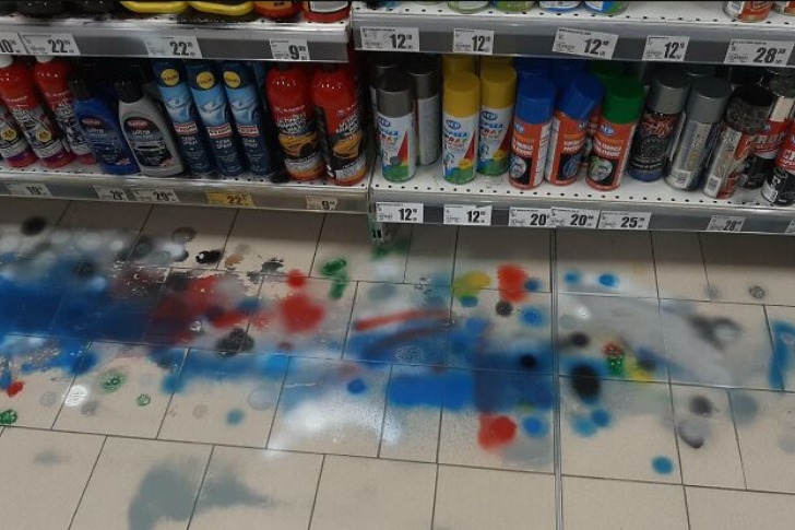 Hardware stores: test spray paint on provided spots, not random surfaces. But these testers turn aisles into abstract art disasters, leaving messes for staff to fix. Why not use the mat?