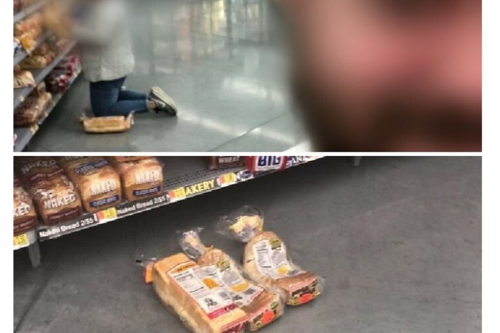 Grocery store bread aisle: where apparently the floor is the perfect perch for inspecting loaves. This lady decided to kneel directly on a stack of fresh bread to get a better look at… more bread. Because why stand when you can crush?