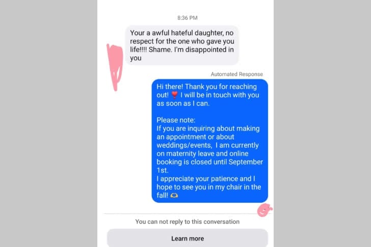 J’ai oublié de la bloquer sur ma page professionnelle, alors qu’est-ce qu’elle fait ? Elle envoie un message à la page pour me lancer une dernière dispute. 😂