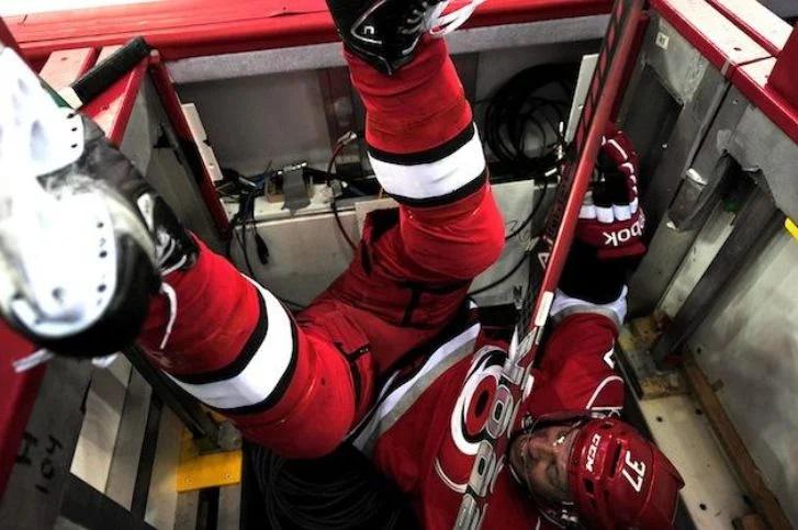 Das Schlittschuhlaufen ist nicht immer einfach, auch wenn es Eishockeyspieler mühelos aussehen lassen. Doch auch sie machen Fehler und geraten manchmal in unangenehme Situationen. So wie der professionelle Spieler auf diesem Bild, der offensichtlich dabei ist, eine unerwartete Herausforderung zu meistern.