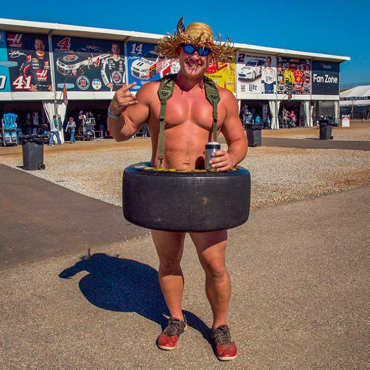 “Normal” kann jeder. Offensichtlich dachte dieser Mann auf dem Bild ähnlich, denn sein Aussehen war alles andere als gewöhnlich. Seine Liebe zu Autos war deutlich sichtbar, da er sich buchstäblich in einen Autoreifen geworfen hatte.