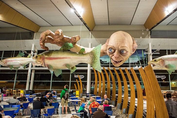 This eye-catching scene from Wellington Airport in New Zealand leaves travelers both amused and a little startled. Suspended from the ceiling, a gigantic sculpture of Gollum from The Lord of the Rings reaches hungrily toward three equally massive fish, his bug-eyed expression frozen in excitement. It’s not something you expect to see when grabbing a snack or waiting for your flight, but it’s undeniably a creative tribute to the country’s deep connection to the legendary film series.