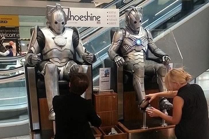 At first glance, this scene could easily confuse an unprepared traveler—two metallic humanoids sitting upright in a shoe-shine chair like it’s just another Tuesday. But for fans of sci-fi, it’s a delightful and surreal surprise: these are Cybermen from Doctor Who, casually getting their “boots” shined. Whether it’s for intimidation or fashion, it seems even galactic villains know the importance of looking sharp, especially in a high-traffic place like an airport.