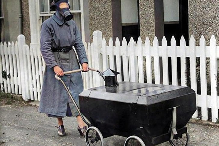 During WWII, British inventors created a terrifying contraption: a gas-proof baby stroller. It looked like a mobile metal coffin with glass panels. Parents could pump filtered air inside to keep their infant safe from attacks—while looking like they were pushing around a robot tomb.