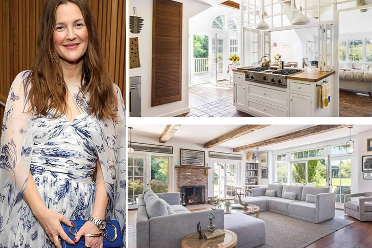 Inside, the house is a celebration of easygoing elegance, featuring sun-drenched rooms, exposed wood beams, vintage accents, and plenty of personal touches that make the space feel truly lived-in. There’s a charming farmhouse-style kitchen, an airy living room with oversized sofas, and several cozy bedrooms, all styled with an eclectic mix of textures and cheerful colors. Outside, a shaded patio and a dreamy backyard garden make it easy to imagine long, laughter-filled afternoons. Drew’s home feels like a true extension of her spirit—bright, authentic, and completely full of heart.