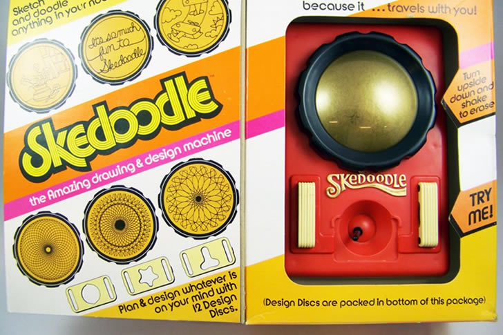 Skedoodle, a joystick-controlled drawing toy similar to an Etch-a-Sketch, was difficult to operate and produced unsettling buzzing noises. Its erratic internal mechanics made it frustrating for kids to draw anything recognizable.