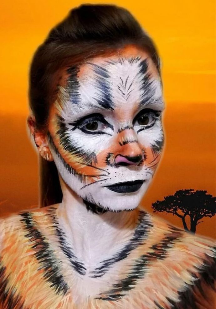 Mit brillanter Körperbemalung verwandelt sich diese Künstlerin in einen Tiger – ein perfektes Halloween-Look, das Tiermalerei auf eine neue Stufe hebt. Sie hat die Farben des Tigerfells (Orange, Weiß, Schwarz) nahtlos in feine Streifen und Muster transformiert, die sogar die Textur der Haut nachahmen.