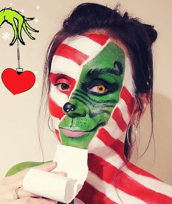 Die raue Gestalt aus Dr. Seuss’ Klassiker wird hier durch exzellentes Bodypainting lebendig – eine Hommage an Jim Carreys legendäre Darstellung in How the Grinch Stole Christmas. Carrey hinterließ sich für die Rolle eine wahrhafte Transformation: 92 Tage im schweren, grünen Latex-Kostüm, Stundenlang MAKE-UP und sogar Training mit einer CIA-Spezialistin, um die mentale Belastung zu meistern.