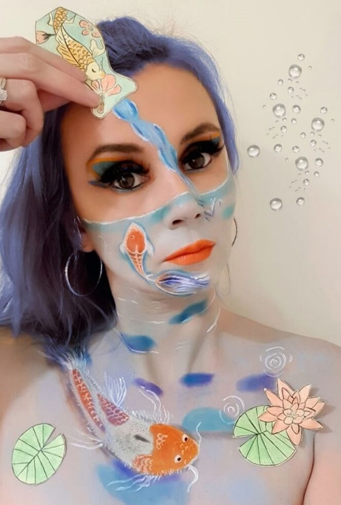 Mit filigraner Körperbemalung entwirft diese Künstlerin einen fließenden Koi-Teich auf ihrer Haut: Sanfte Wellenlinien, vage angedeutete Lotusblüten und die prägenden Umrisse von Koi-Karpfen. Der Fokus liegt auf der minimalistischen Maltechnik, die die Essenz des japanischen Gartensideals einfängt – eine Oase der Ruhe, in der die farbenvollen Karpfen symbolisch für Glück, Mut und Beständigkeit stehen.