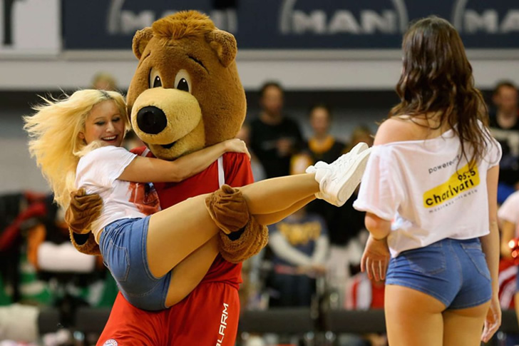 Sportveranstaltungen sind voller Überraschungen – und nicht nur vom Spiel. Während die Fans die Stimmung heizen, sorgen Cheerleader und Maskottchen für das Extra im Pausenprogramm. Und dieses Maskottchen-Bärchen weiß genau, wie es zu punkten: Indem es eine Cheerleaderin mitten im Showstück hoch hebt.