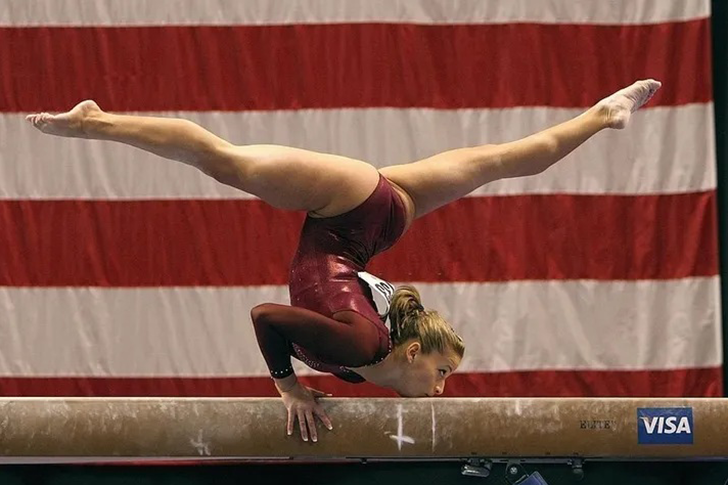 Was für eine Konzentration! Sie balanciert unglaublich beeindruckend ihr Gewicht auf dem Kinn. Normalerweise zeichnen sich Turnerinnen durch erstaunliche Flexibilität und Körperkontrolle aus – aber sie scheint einen Schritt weiter zu gehen.