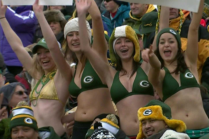 Während die Green Bay Packers auf dem Feld mit Muskeln punkten, zeigen diese Vier im Publikum, dass Härte auch in Form von Kältebeständigkeit existiert. Während andere Zuschauer in Winterjacken hocken, ziehen sie lediglich Bikini-Oberteile und Hüte – obwohl die Kälte offensichtlich ist.