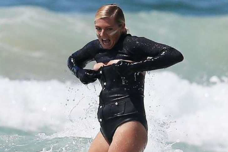 Beim Surfen ist ein passender Anzug unverzichtbar: Er schützt vor Kälte und garantiert Bewegungsfreiheit. Die Dame auf dem Surfbrett scheint diesen Grundsatz missverstanden zu haben – ihr Bikini-Azug sieht stylisch aus, aber für wilde Wellen ist er less than ideal.