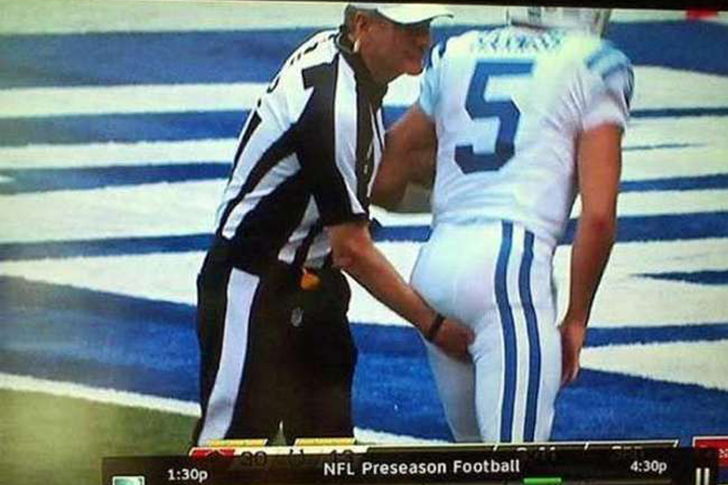 Was genau hat der Fotograf hier eingefangen? Einerlei: Dieser Griff von Schiedsrichter auf Spieler wirkt nicht wie ein regulärer Spielzug. Vielleicht wollte er nur die Kleidung korrigieren – aber solche Kontrollen gehören normalerweise vor dem Spiel, nicht mitten im Stadion voller Fans.