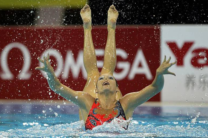 Unheimlich perfekt: Ist das eine Truppe Wassertänzerinnen oder Taucher? Die synchrone Bewegung creates eine optische Illusion, die den Blick verwirrt. Sind das zwei separate Personen oder eine “Superfrau” mit gigantischen Proportionen?