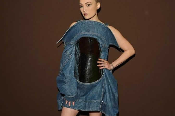 Si bien el estilo vanguardista consiste en romper las reglas, esta chaqueta parece haber roto su propia integridad estructural. Se siente menos como una obra maestra de pasarela y más como un proyecto de bricolaje que salió hilarantemente mal después de demasiados cócteles artesanales. ¡Hay que admirar la cara de póker de la modelo; es difícil parecer seria cuando esencialmente llevas un aro de mezclilla alrededor de tu torso!
