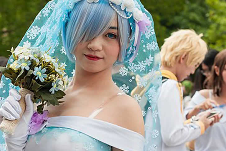 Este vestido sin duda se inspiró en un personaje de anime. Esperamos que se hayan casado en invierno, de lo contrario, los copos de nieve no tienen sentido. Espera, un velo azul con copos de nieve tampoco tiene mucho sentido. Además de los copos de nieve, también hay rosas adornando su vestido.