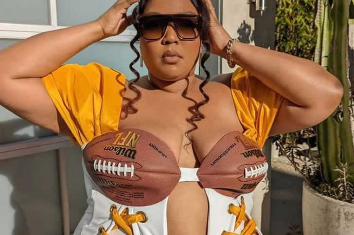 Este es el momento definitivo de “día de partido, pero con un toque picante”: un vestido blanco acordonado como una camiseta de fútbol americano, mangas de color amarillo brillante y dos balones de fútbol americano Wilson de tamaño completo orgullosamente posicionados como los sujetadores más comprometidos en la historia del deporte. Escote pronunciado, cordones de corsé, gafas de sol grandes y ese moño altísimo: es seguro, es exagerado y está gritando “¡touchdown o nada!”.