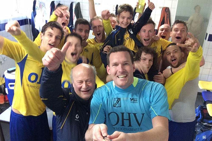 Blick in die obere rechte Ecke: Ein Teammitglied fehlt in der euphorischen Gruppe. Warum? Er wollte sich schnell duschen und fürs Foto frisch machen – also schnappte er sich einen Duschvorhang, um sich zu verstecken. Aber seine Kollegen merkten nicht, dass er fehlte. Zumindest ist er “teil der Mannschaft” geblieben – auf seine eigene Art.