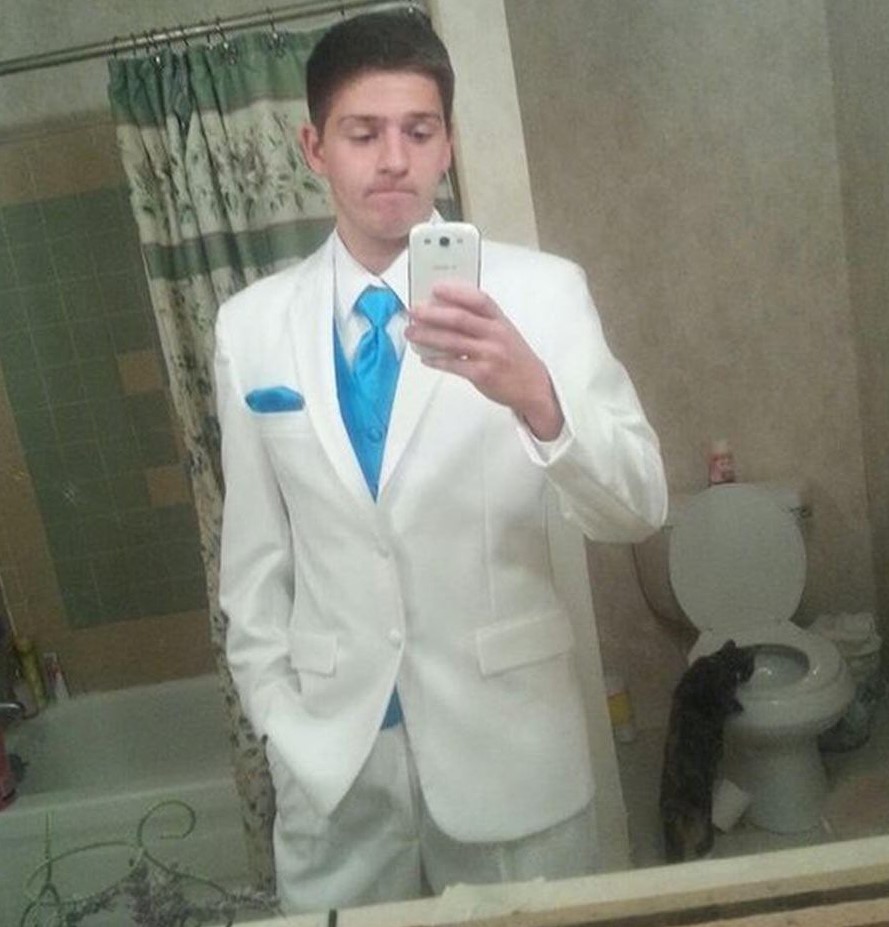 Der Mann sieht definitiv schick aus! Ob er zum Abschlussball geht oder einfach Lust hatte, sich für einen Besuch bei Chuck E. Cheese stylish zu kleiden, er scheint sich in diesem Outfit wirklich wohlzufühlen. Und während er seinen weißen Anzug und seine blaue Seidenkrawatte geliebt haben mag, können wir nur annehmen, dass seine Katze mit seinen modischen Entscheidungen nicht ganz einverstanden war…