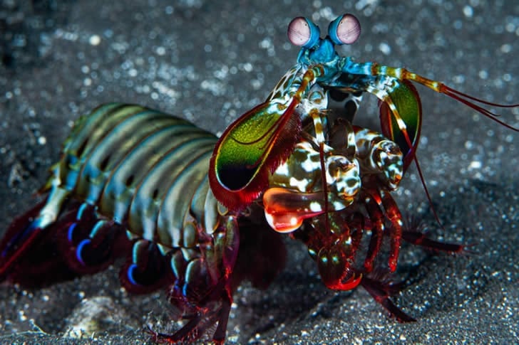 Die Pfauenaugen-Mantisgarnele ist ein auffälliges Krebstier mit einem regenbogenfarbenen Exoskelett und zwei keulenartigen Anhängseln, die mit unglaublicher Geschwindigkeit zuschlagen. Sie lebt in Korallenriffen im gesamten Indopazifik und versteckt sich meist in Höhlen.