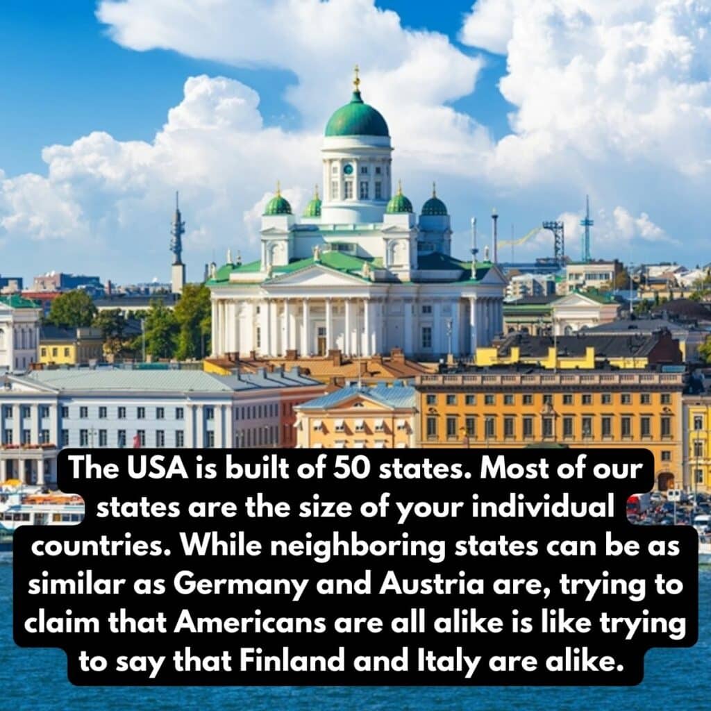 Comparar Europa y América es como intentar comparar un abejorro con un hipopótamo.Claro, ambos son animales, pero ahí terminan las similitudes. Cada estado de EE. UU. tiene su propia identidad, historia y cultura. Es como un crisol de crisoles. Aquí tienes algunos consejos para los europeos…