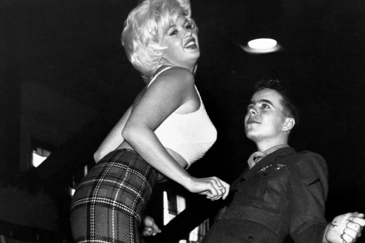 In dem folgenden Bild sehen wir einen voller Lebenskraft Marine, der den Twist mit der amerikanischen Schauspielerin und Sexsymbol Jayne Mansfield tanzt, an der US Naval Station in Newfoundland im Jahr 1961. Bekannt für ihre provozierende Persona, war Mansfield eine Schauspielerin, Sängerin und Playboy Playmate, die einen einzigartigen Reiz hatte, der ihre zahlreichen Fans nach mehr verlangen ließ.