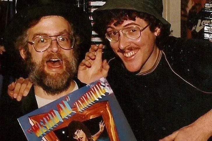 In dem folgenden Bild kann man den international bekannten musikalischen Parodiekünstler “Weird Al” Yankovic (rechts) entdecken, der eine verspielte Pose einnimmt neben Barret Eugene Hansen, bekannt als “Dr. Demento”. Dieser Snapshot fängt den Komiker während der Aufzeichnung seiner Live-Darstellung der Queen-Parodie “Another One Rides the Bus” auf der Dr. Demento Show im Jahr 1980 ein. Breitgehend gefeiert für seine humorvolle Interpretation beliebter Songs und Lyrics, ist Yankovic weltweit berühmt nicht nur für seine launige öffentliche Persona, sondern auch für seine herrlich exzentrischen Modestile.