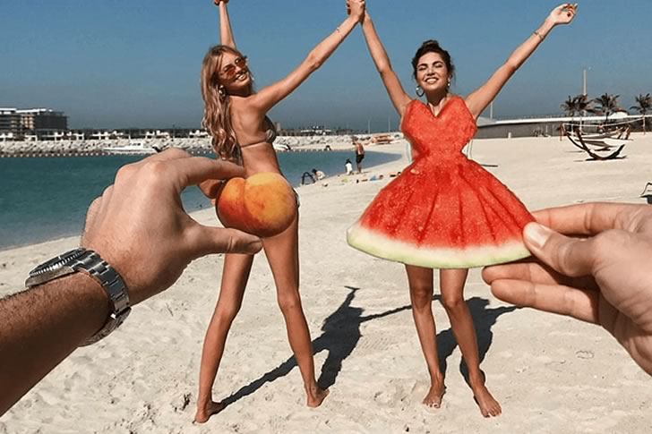Zwei Frauen nehmen dramatische Posen am Strand ein, während riesige Hände im Vordergrund sie „ankleiden“: Eine bekommt einen Pfirsich-Bikiniboden, die andere ein komplettes Wassermelonenkleid. Die optische Täuschung ist so perfekt, dass es aussieht, als hätte Mutter Natur selbst beschlossen, mit Supermarktprodukten Stylistin zu spielen.