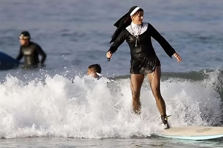 Eine voll bekleidete Nonne in traditionellem schwarzem Habit und weißer Haube reitet irgendwie eine Welle, als würde sie für Point Break 2: Holy Water vorsprechen. Die Arme zum Gleichgewicht ausgestreckt, der Schleier flattert wie eine hüpfende Kruzifix-Halskette, sie wirkt gleichermaßen gelassen und bereit, den Ozean selbst auszutreiben.