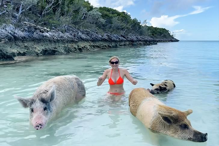 Das ist entweder der Anfang eines Disney-Films oder die verrückteste Junggesellinnenparty überhaupt. Die Schweine genießen sichtlich ihr bestes Leben, schweben lässig dahin, während sie posiert, als hätte sie die Bahamas nur mit Sonnencreme und Selbstvertrauen erobert.