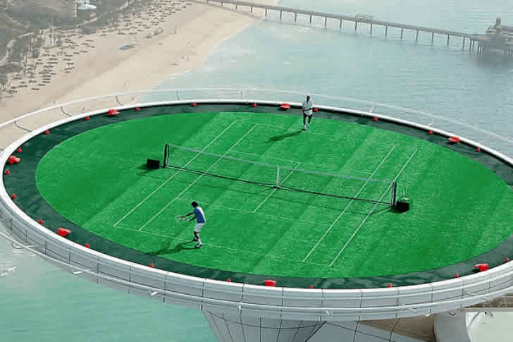 高層ビルの屋上に設置されたテニスコートで、2人の選手が試合をする瞬間が高空から撮影されています。この写真は、人間の創造力と冒険心を捉えた驚異的な一瞬で、緑のコートが青い海とビーチを背景に浮かんでいるような幻想的な光景を創り出しています。コートの周囲に設けられた赤いフェンスが、地上数百メートルの高さを強調し、緊張感と興奮を際立たせています。