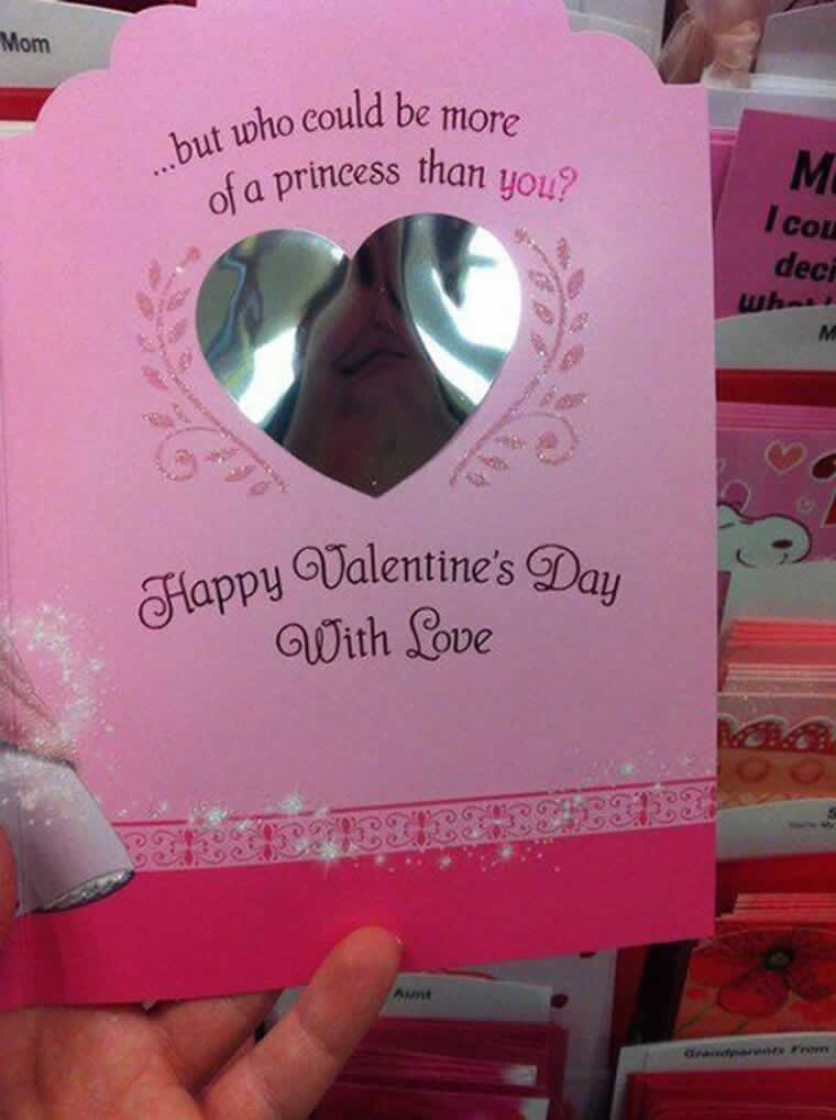 Quand on est amoureux, on pense que son partenaire est la plus belle personne sur Terre. Cette carte de vœux a tenté de capitaliser sur cela en incluant un petit miroir à l’intérieur. L’idée était d’appeler la destinataire une « princesse » en la voyant regarder son reflet. Malheureusement, le miroir en plastique bon marché a déformé son visage en un monstre.