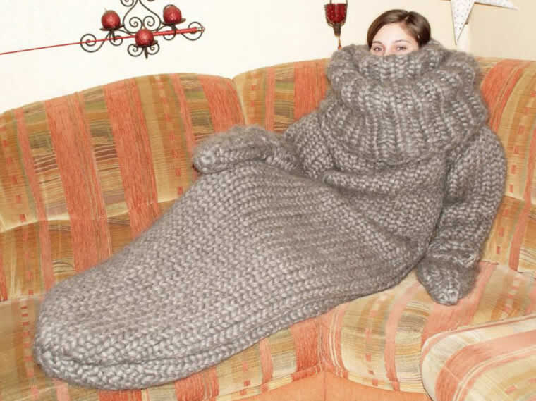 Si vous prévoyez de faire des câlins, vous voulez généralement pouvoir bouger vos bras. Ce cadeau tricoté semble ignorer cette exigence fondamentale. C’est un cocon géant en laine qui emprisonne complètement la personne à l’intérieur. On dirait une chenille de taille humaine. Difficile de rester romantique quand on ne peut même pas atteindre un verre d’eau !
